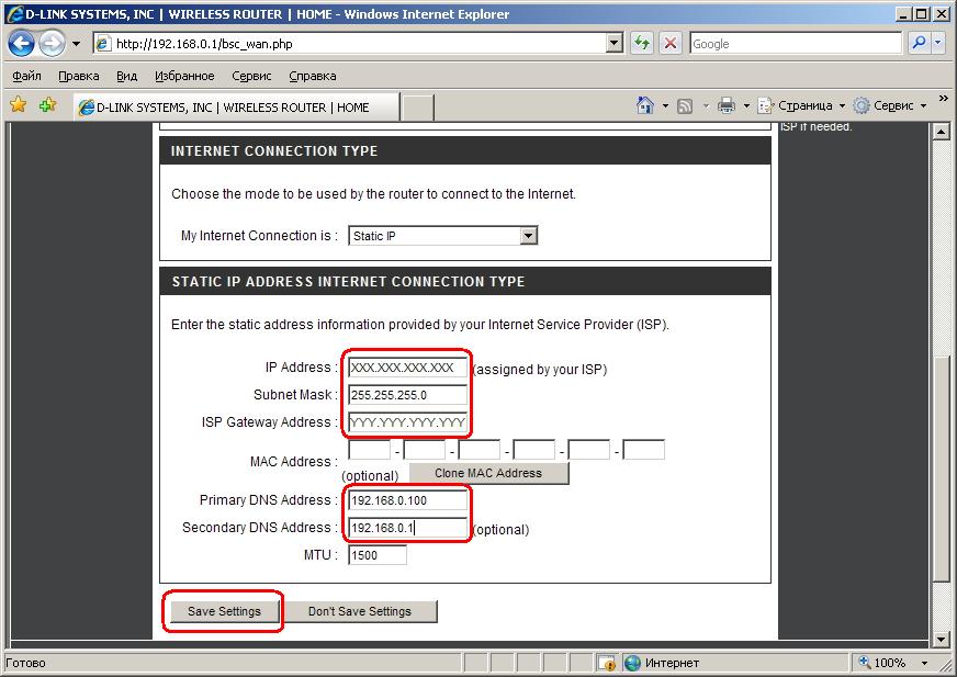 Примечание. На скриншоте, приведенном выше, в настройках IP-адреса и Шлюза вместо реальных цифр указано условное обозначение XX и YY. Вам, конечно, необходимо вводить цифры указанные в Вашей регистрационной карточке!