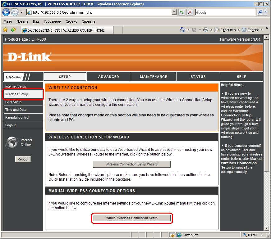 Нажимаем кнопку Manual Wireless Connection Setup.