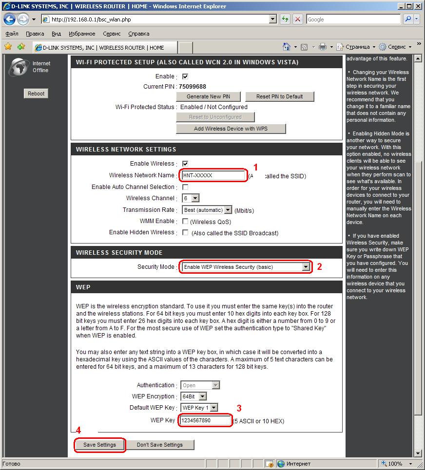 В подразделе WEP вводим десятизначный ключ шифрования сети, который спросит компьютер при первом подключении к роутеру через WI-FI. (ВНИМАНИЕ! На рисунке для примера используется ключ: 1234567890, Вам необходимо придумать свой ключ! запомнить его или записать и хранить в недоступном месте) (3)