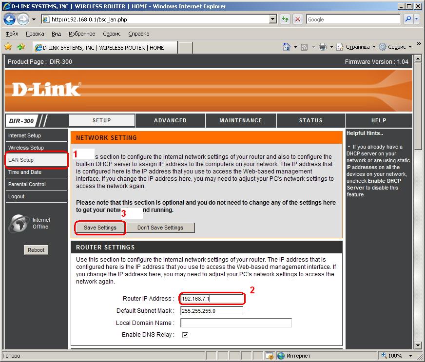 Далее в разделе Дополнительно заходим в подраздел Параметры локальной сети (на скриншоте шаг 1). Этот раздел позволяет поменять IP-адрес интернет-маршрутизатора во внутренней сети (LAN) и определить диапазон адресов автоматически распределяемых роутером внутри сети. Настройку этого раздела можно оставить без изменений. Но поскольку подсеть 192.168.1.0/24 также используется внутри локальной сети HNT, мы рекомендуем изменить ее на подсеть 192.168.7.0/24. Для этого необходимо сделать следующие изменения (шаг 2). И по окончании нажать Применить (шаг 3):