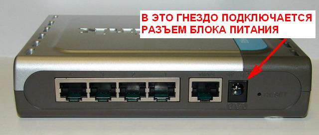 Распаковываем коробку с интернет-маршрутизатором и сначала подключаем его к электрической сети. Для этого разъем блока питания подключаем в соответствующее гнездо на задней панели роутера (см.фото).