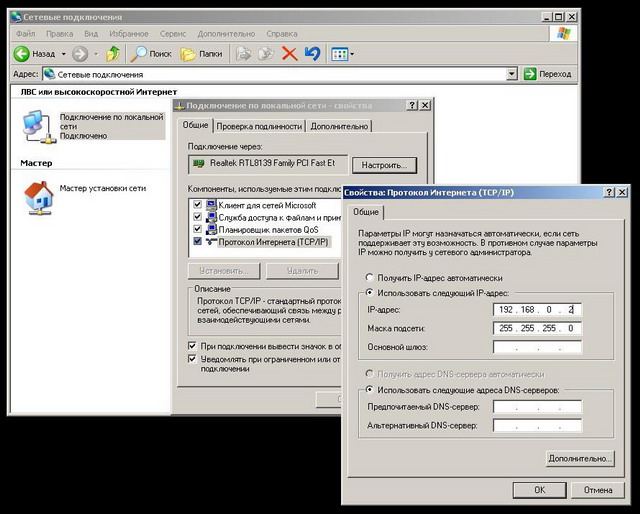 Для этого на компьютере заходим Пуск - Панель управления - Сетевые подключения. Нажимаем правую кнопку мышки на иконке Подключение по локальной сети и левой кнопкой мыши, в открывшемся меню, выбираем Свойства. После этого заходим в свойства Протокол Интернета TCP/IP и вбиваем IP-адрес: 192.168.0.2 и маску подсети: 255.255.255.0 (см. скриншот)