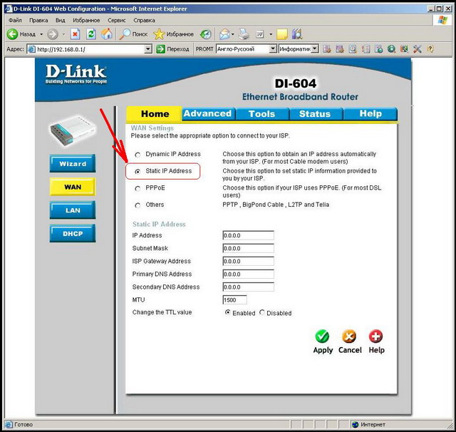 В подразделе Internet Connection Type выбираем левой кнопкой мыши Static IP.