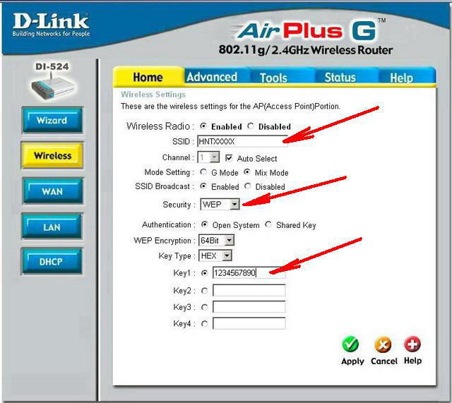 4. При настройке Интернет-маршрутизатора с Wi-Fi необходимо еще настроить раздел Wireless (так он называется у роутеров DI-524). В этом разделенеобходимо: