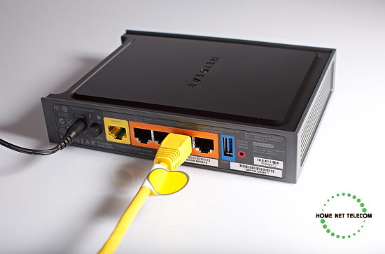 Подключите кабель HNT в синее гнездо роутера с надписью с надписью "WAN" или "Internet" Подключите патч-корд (короткий кабель поставляемый в комплекте с роутером) в один из жёлтых разъемов “LAN” на маршрутизаторе с одной стороны и в разъём сетевой платы вашего компьютера с другой стороны. Включите блок питания роутера в электрическую розетку и нажмите черную кнопку включения питания.