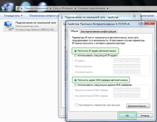 Перед тем как начать настройку роутера, измените настройки компьютера так, чтобы получение сетевых настроек происходило автоматически.