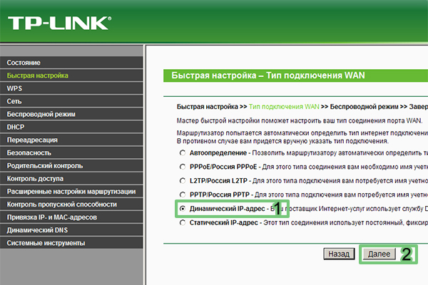 В разделе "Тип подключения WAN" (WAN Connection Type)- выбирите Динамический IP адрес (dynamic IP) и нажимаем кнопку Далее (Next)