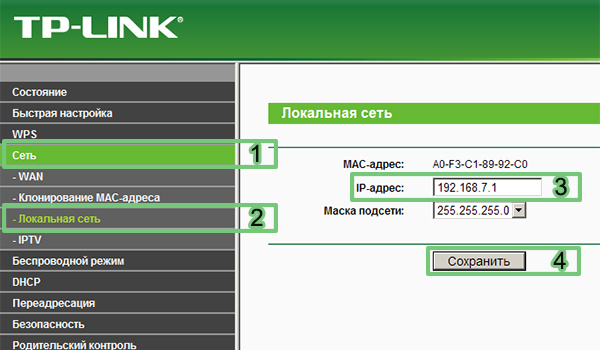 Для этого нажимаем кнопку LAN и и меняем IP-адрес 192.168.0.1 на 192.168.7.1