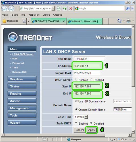 В разделе Main настраиваем подраздел LAN & DHCP Server. Этот раздел позволяет задать IP-адреса интернет-маршрутизатора для внутренней сети LAN и определить диапазон адресов автоматически распределяемых роутером внутри сети LAN. Настройку этого раздела можно оставить без изменений. Но поскольку подсеть 192.168.10.0/24 используется внутри локальной сети HNT, мы рекомендуем изменить ее на подсеть 192.168.7.0/24. Для этого необходимо сделать следующие изменения (на скиншоте шаг 1-3 ). И по окончании нажать Apply (шаг 4):