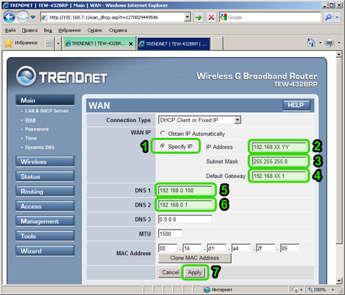 В этом подразделе необходимо внести параметры IP, предоставленные провайдером Home Net Telecom. Эти параметры находятся в Вашей Регистрационной карточке абонента в разделе Настройки протокола TCP/IP. Для этого в разделе WAN выберите Specify IP (1 шаг на скриншоте) и заполните пять строчек: IP адрес (2 шаг), Маска подсети (3 шаг), Шлюз (4 шаг), Предпочитаемый ДНС (5 шаг), Альтернативный ДНС (6 шаг). Убедившись, что все введеные настройки в точности совпадают с регистрационной карочкой, нажимайте Apply (7 шаг):