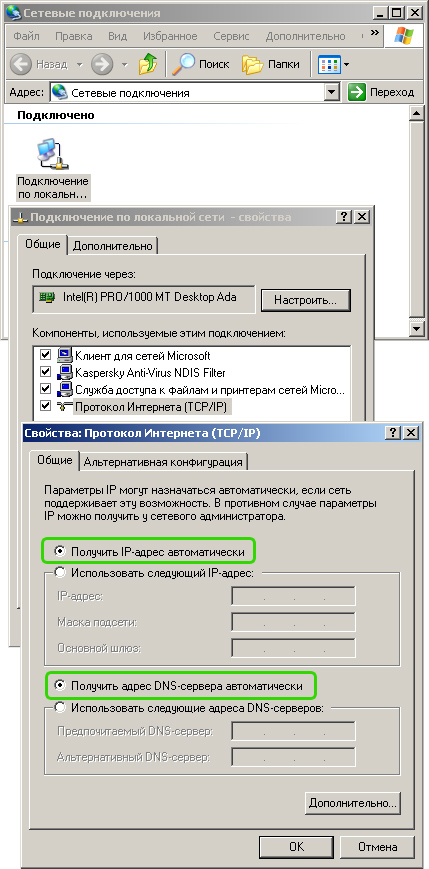 Для этого на компьютере заходимПуск - Панель управления - Сетевые подключения. Далее нажимаем правую кнопку мышки на иконкеПодключение по локальной сети и выбираемСвойства. После этого заходим в свойства Протокола Интернета TCP/IP и выбираем Получить IP-адрес автоматически и Получить адрес DNS-сервера автоматически (см. скриншот)