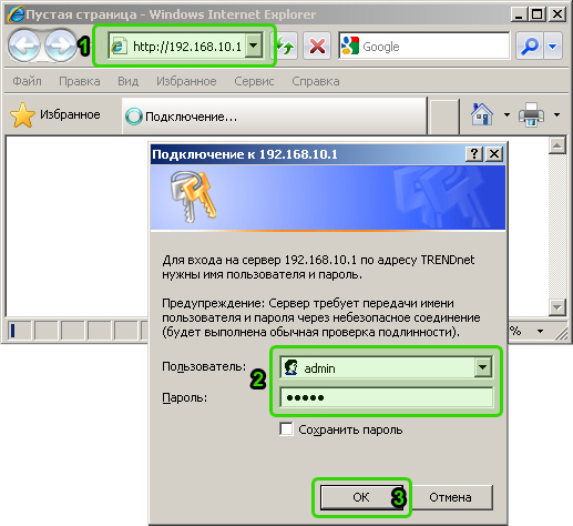 После этого в всплывающем окошке необходимо ввести имя Пользователя и Пароль. По умолчанию для интернет-маршрутизатора Trendnet TEW-432BRP в поле Пользователь необходимо ввести: admin и в поле Пароль: admin (шаг2). Затем нажать OK (шаг 3).